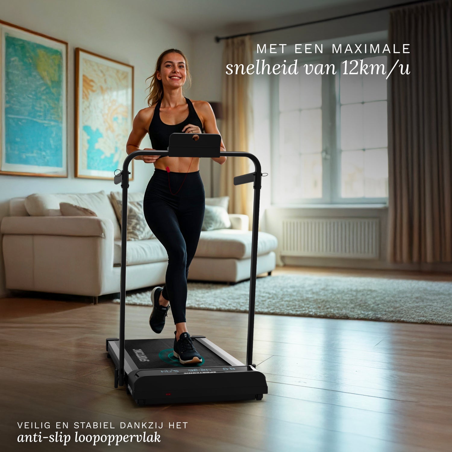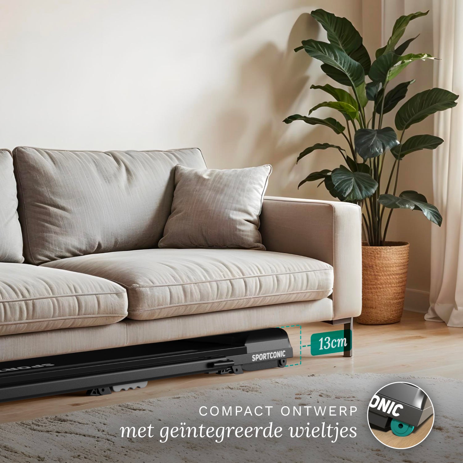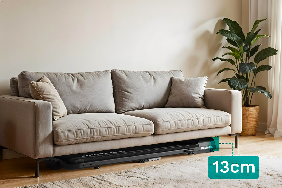 Bežecký pás je vďaka svojmu inteligentnému a kompaktnému dizajnu ideálny na domáce použitie. Vďaka zloženej výške iba 13 centimetrov sa bez námahy zasunie pod pohovku, posteľ alebo skriňu. Integrované kolieska umožňujú rýchle a jednoduché premiestňovanie aj v menších obytných priestoroch.