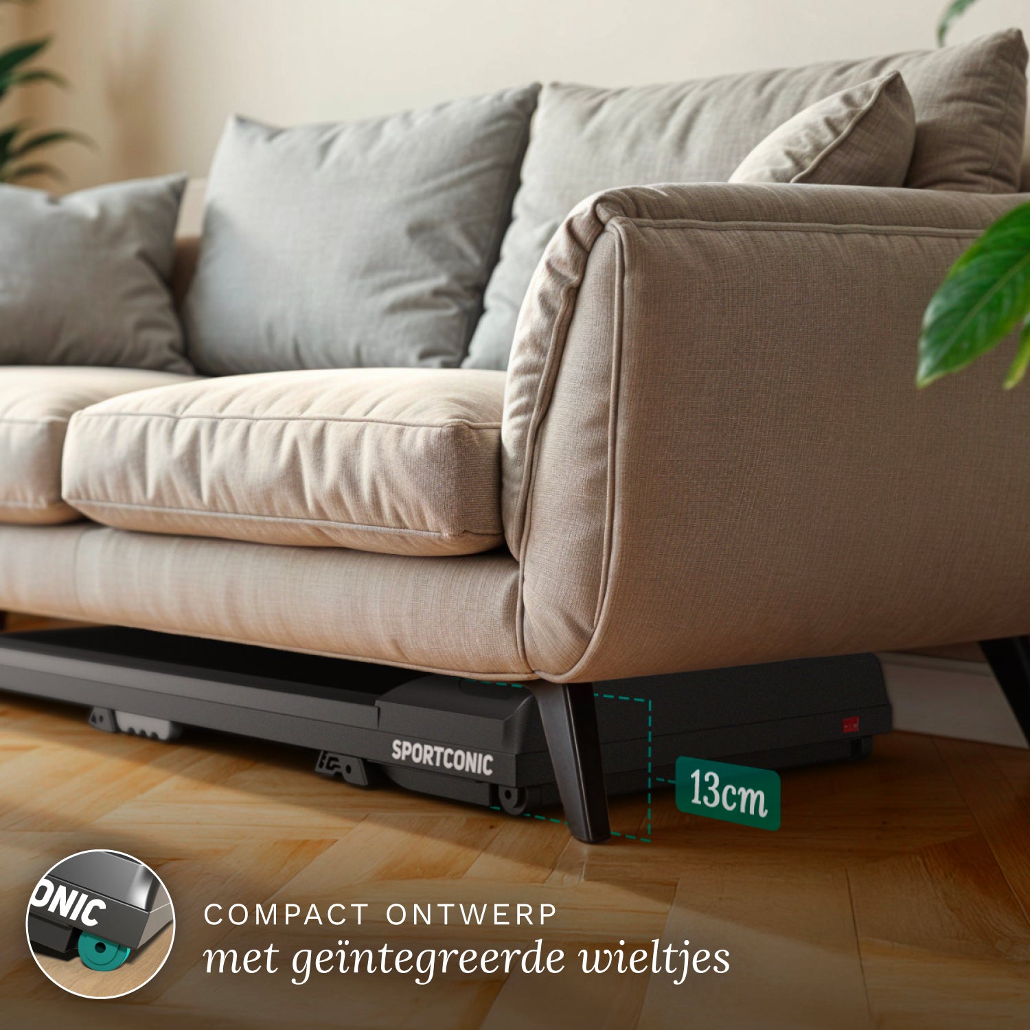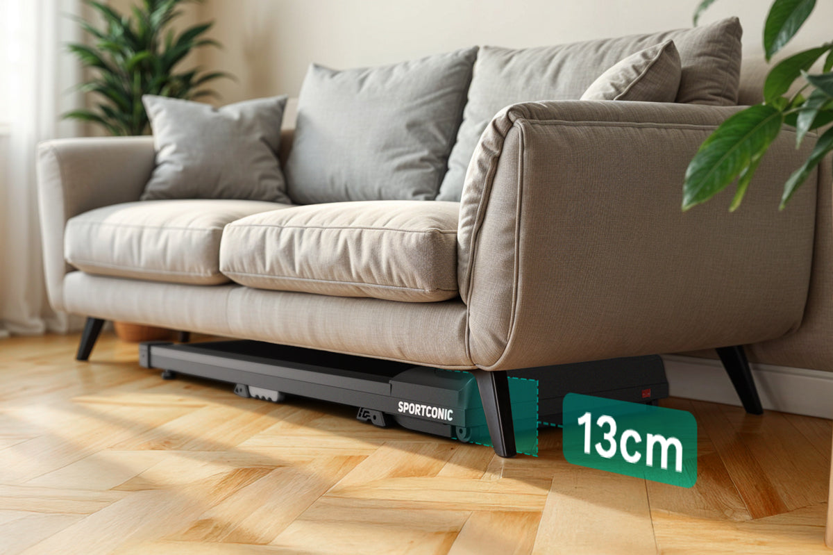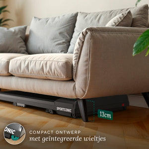 Bežecký pás je vďaka svojmu inteligentnému a kompaktnému dizajnu ideálny na domáce použitie. S výškou iba 13 centimetrov sa bez námahy zasunie pod pohovku, posteľ alebo skriňu. Integrované kolieska umožňujú rýchle a jednoduché premiestňovanie aj v menších obytných priestoroch.