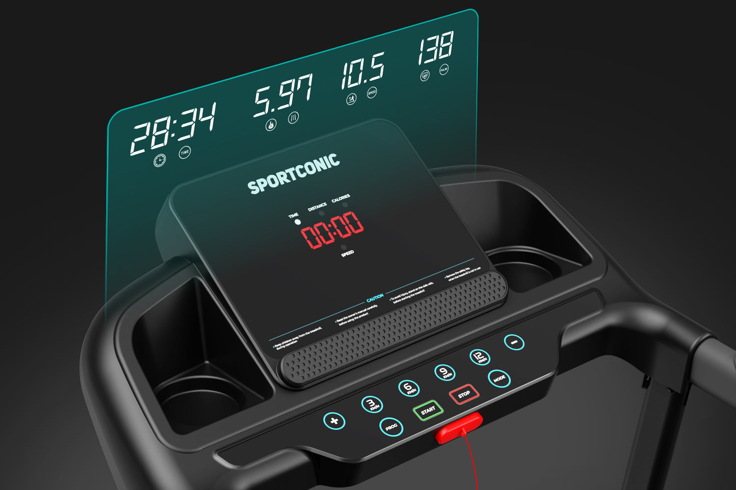 Bežecký pás má jasný LED displej, ktorý vám v reálnom čase zobrazuje prejdenú vzdialenosť, čas, rýchlosť, srdcovú frekvenciu a spálené kalórie.